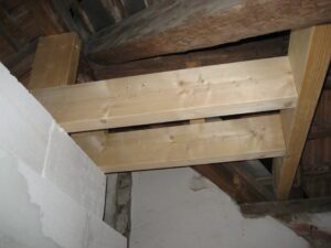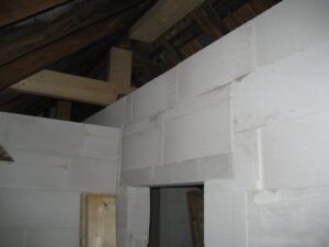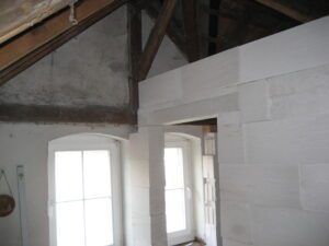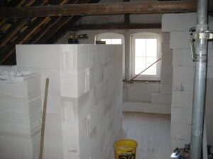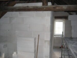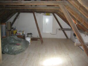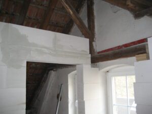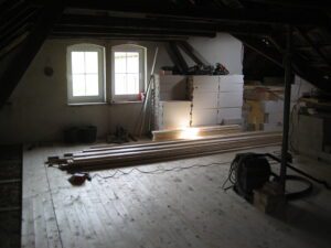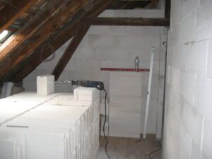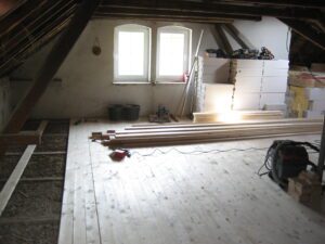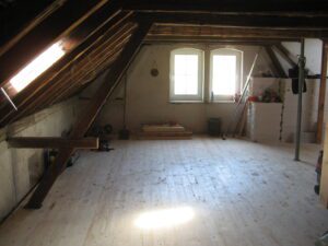 Das Dachgeschoss links Ebene 3 steht mit 40qm als Ausbaureserve zur Verfügung. Hier wurde die Dielung komplett ausgetauscht. Die Innenwände aus Ytong sind als Vorbereitung für den Innenausbau angelegt und an die vorhandene Dachkonstruktion angepasst.