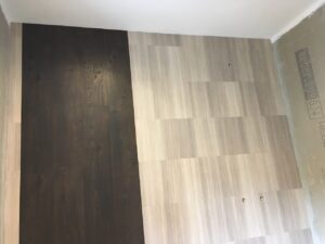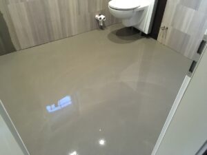 Der Bodenaufbau besteht aus einer Schweißbahn, Ausgleichschüttung, Estrichdämmplatte 10cm, Fermacellplatte 20mm, einem Bodenausgleich und nachfolgend einem Vinyl-Bodenbelag von Amtico.