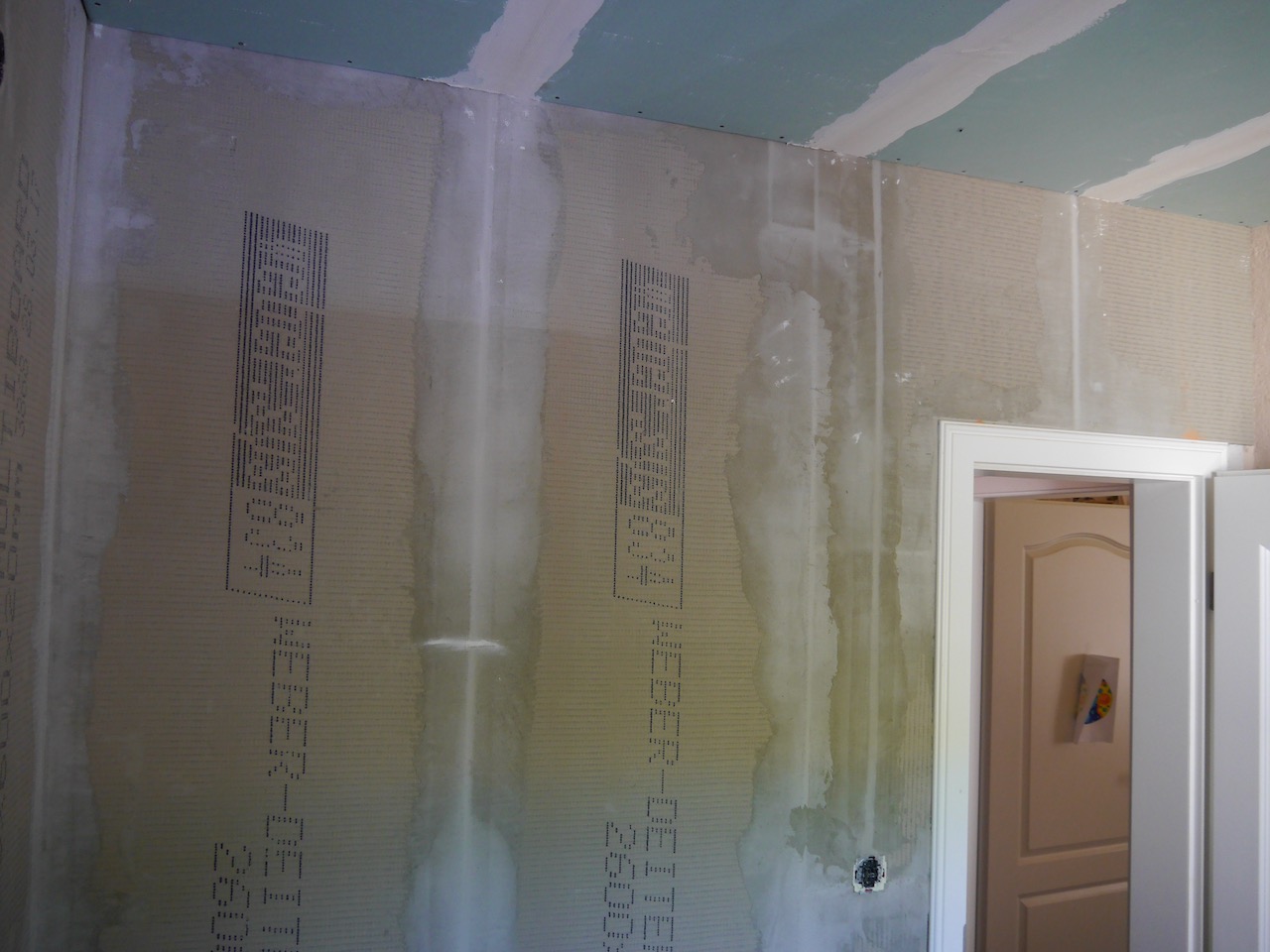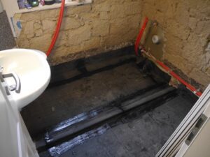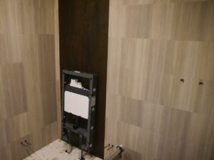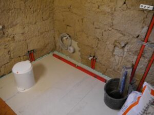 Das Bad wurde 2018 vollständig rückgebaut. Die Installationen sind im Rehau-System in Rautitan ausgeführt. Die abgehangene Decke ist mit Rigips-Feuchtraumplatten doppelt beplankt und mit Herbol-Silikatfarbe weiß beschichtet.