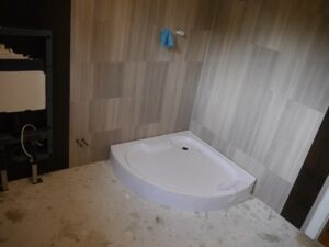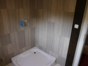 Die Wände wurden mit einer Weber-SYS 834 Fliesenbauplatte verkleidet, was eine Schimmelbildung verhindert. Die Wände sind mit einem Vinyl-Belag von Amtico gestaltet. Ein Flächenheizkörper und ein Heizkörper als Handtuchtrockner sorgen für schnelle Wärme im Raum.