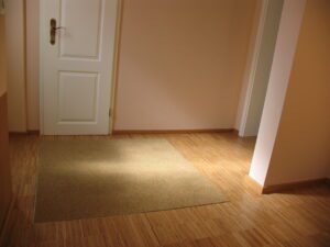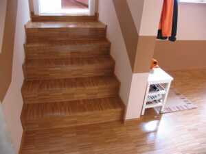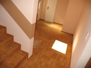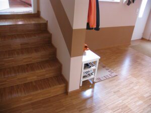 Im Flur Ebene 1 mit der Treppe in die Wohnküche Ebene 2 wurde ein strapazierfähiger Echtholz-Parkettboden aus Bambus vollflächig verklebt, geschliffen und versiegelt. Im Eingangsbereich ist eine Sauberlaufmatte eingearbeitet.